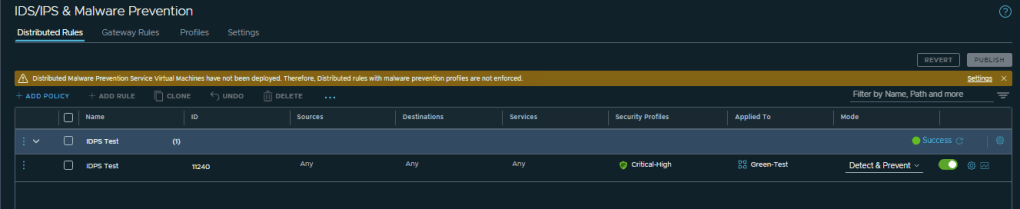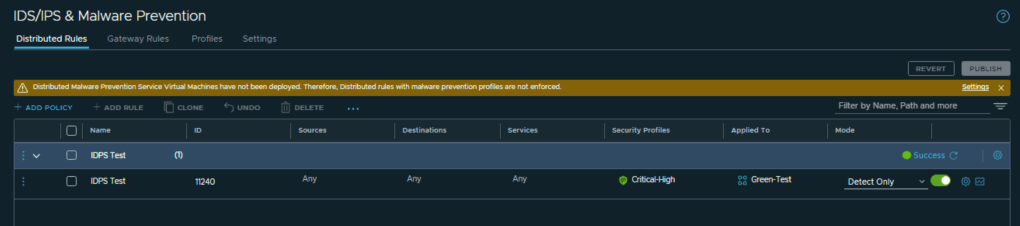 Created a test rule called IDPS-Test with Source, Destination and Service as Any-Any-Any, but I have applied the rule only to a Security Group “Green-Test” where I have my test virtual machines. The rule is in Detect Only Mode.