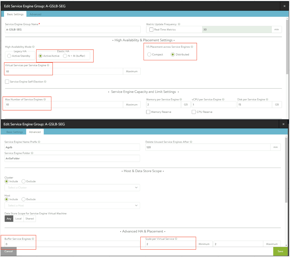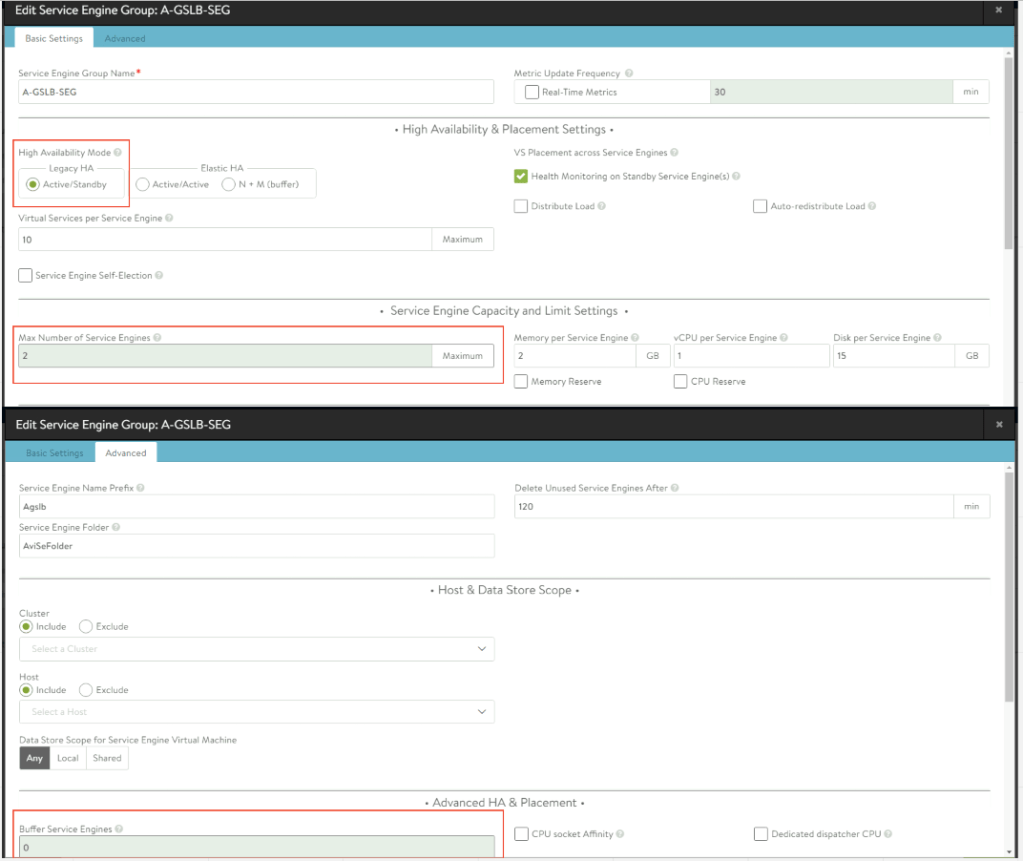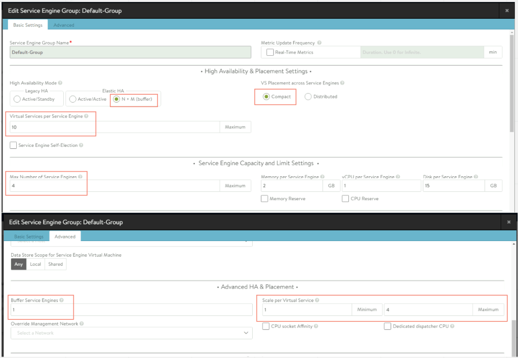 ITGuy: Good observation, service engine group setting depends on the cloud that you are using for the SE group and thus it differs the setting. On the first image it was a no-orchestrator cloud, and this image is from the vCenter cloud thus you see setting for Memory/vCPU/Disk etc.
