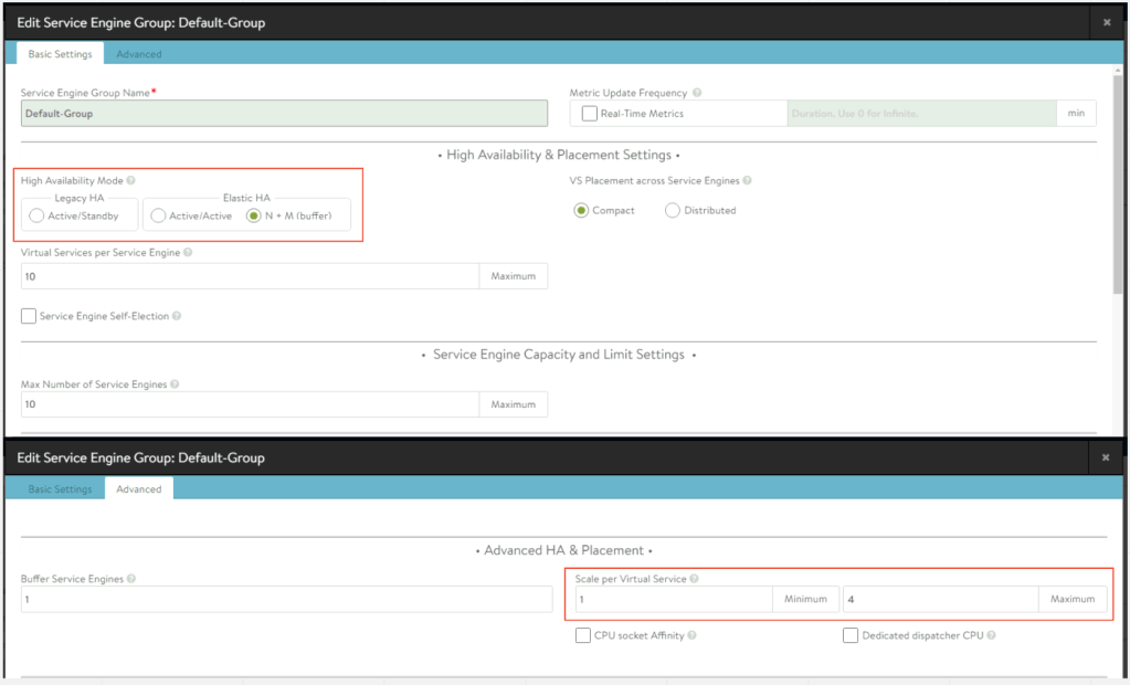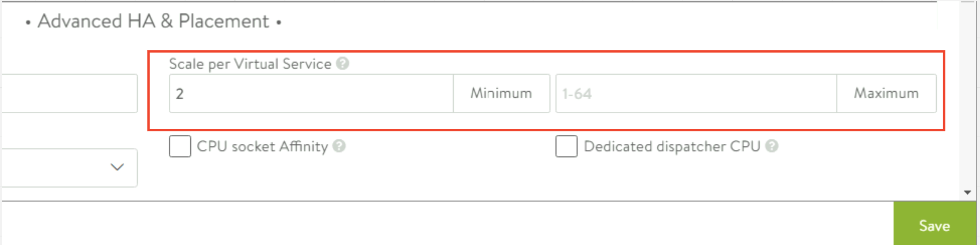 This setting on the Advanced Tab specifies the Minimum and Maximum Scale of all the virtual services placed on this Service Engine Group. As you can see the Maximum Scale is 64. This setting is applicable to all the Virtual Services and if you need a particular virtual service to be scaled to a higher number(less than the Max defined) then you can do it on the virtual service level like below.