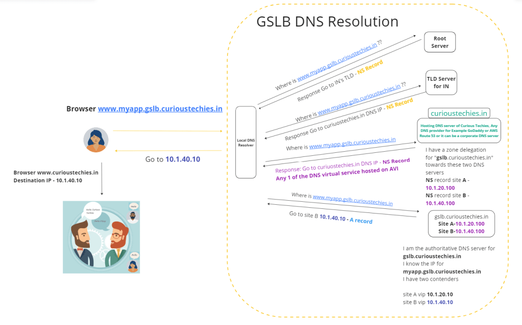 For example, you have a corporate domain called “curioustechies.in”, you will need to create a subdomain for example “gslb.curioutechies.in” and create a zone delegation for this domain to the DNS service that you will host on AVI. Any DNS queries coming for “gslb.curioutechies.in” will be forwarded to the AVI hosted DNS service for name resolution.