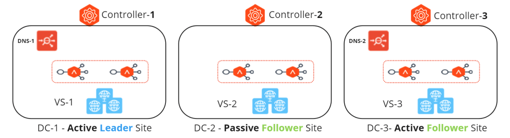 It is not mandatory to have a DNS service in all the GSLB sites, in AVI terminology if you are not running a DNS service in a site but you do have Virtual Service/Pool members in that site then itās called a Passive site. As you see below DC-1 and DC-3 are Active sites as they are hosting the DNS services, but DC-2 is a Passive site as it doesn’t host a DNS service, although it does have Virtual services which can take part in a GSLB configuration.