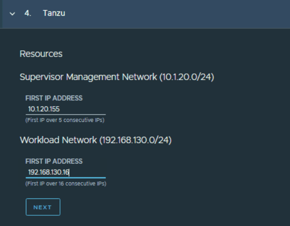 - Few IP details about the TKGs Supervisor VMs which shall connect to Management and workload network. NOTE: There are in-built checks in the automation appliance and it will not allow to proceed if there are any IP overlaps etc.