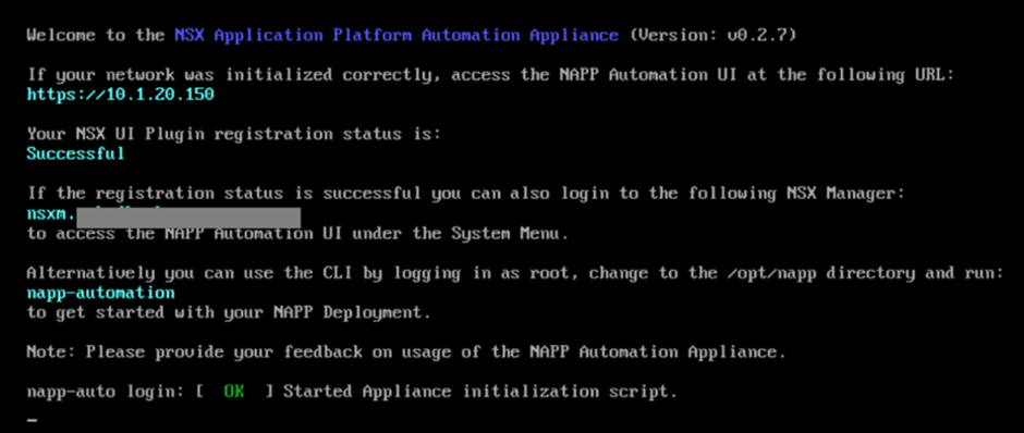 Once the appliance is up you can see the registration status in the console and then you can use the given IP to access it or use the NSX plugin to access it (recommended).