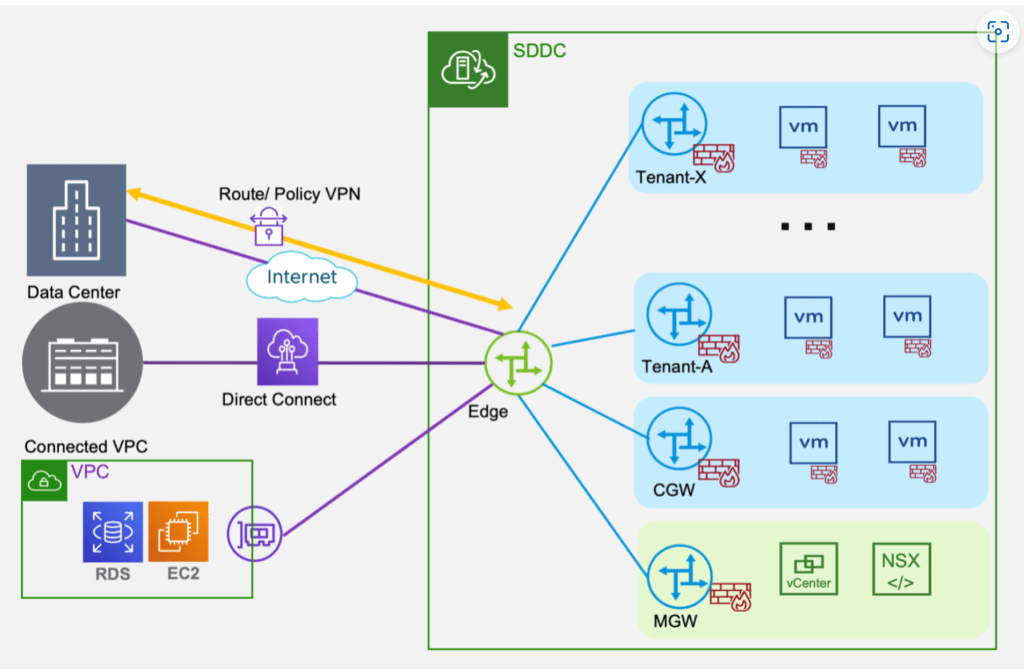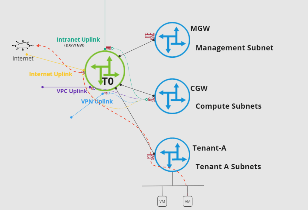 For example, consider a VM connected to a segment behind Tenant-A Tier-1 gateway needs to reach out to internet. There could be rule to allow or drop that traffic at Tier-1 gateway(Default is ALLOW) and there must be a rule to allow or drop that traffic at CGW(Default is DROP). Red line shows the traffic passing through different components of NSX inside the SDDC of VMConAWS.
