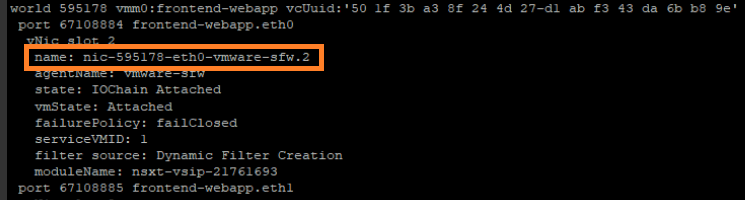 - Find the Name of the vnic filter that you want to check the applied rules Ex. “name: nic-595178-eth0-vmware-sfw.2“