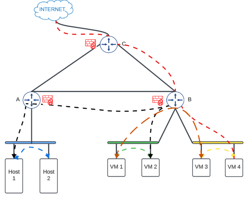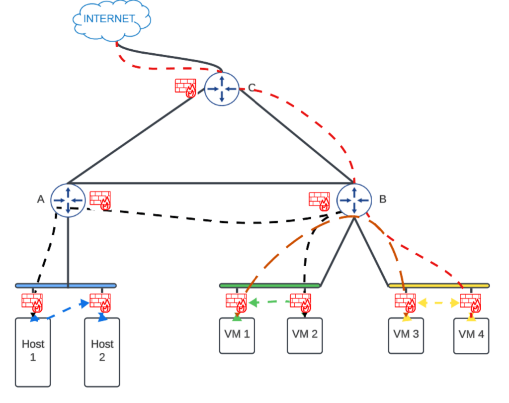 ITGuy: Traditionally, you would divide zones as per your organization’s need and have dedicated subnets/vlans for each zone. Firewalls would be placed at the Layer2 boundary in-line with Layer3 router. In the below diagram, you can place Host 1 &2 and VM’s in different zones . You can place VM 1 &2 in one zone and VM 3 &4 in other zone because you are passing the traffic via Router and can potentially inspect the traffic via Firewall(Black & Brown) in the below figure.