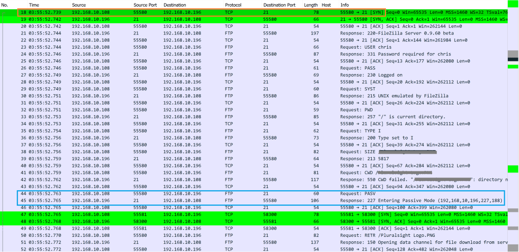 FTP communication started at packet number 18, you can see the Source 192.168.10.108 and Destination FTP server 192.168.10.196 with Port 21. The user gets authenticated. Then, look at packet number 44 & 45. A request for PASV is sent to the FTP server and FTP server responds stating “Entering Passive Mode”. Lets take a look inside packet number 45.