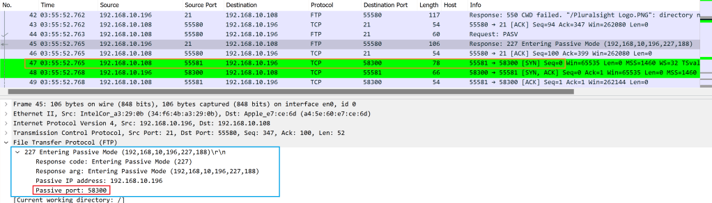 FTP server sent back a Passive Port: 58300. The client will use this port to connect to the FTP server for further data communication. Packet number 47 shows a new TCP connection from Source 192.168.10.108 and Destination FTP server 192.168.10.196 with Port 58300.