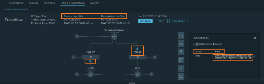 ITGuy: Distributed Firewall means its actually applied on the vnic of a VM. If you have two VM’s with one vnic each, then you have two Firewalls in the context of your Applied To field. The same applies in other scenarios with multiple VM’s. Let’s open the Traceflow utility and run a trace between your App and DB VM to understand this better.