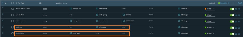 In simple terms, a Catch-All rule is a temporary monitoring rule placed at the bottom of an application-specific Distributed Firewall policy to observe traffic that is not yet explicitly allowed. This rule is typically configured in ALLOW mode with logging enabled during the discovery phase, prior to enforcing a strict default DROP posture.