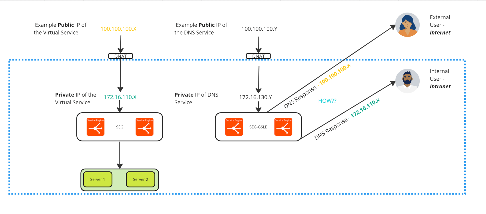 CuriousTechie: Yes! I have a fair understanding of GSLB, but I am looking for some specifics around how the GSLB DNS service determines which IP (Public or Private) it provides in the DNS response for Internal and External users. Can you help me to get some clarity and show the actual configuration?